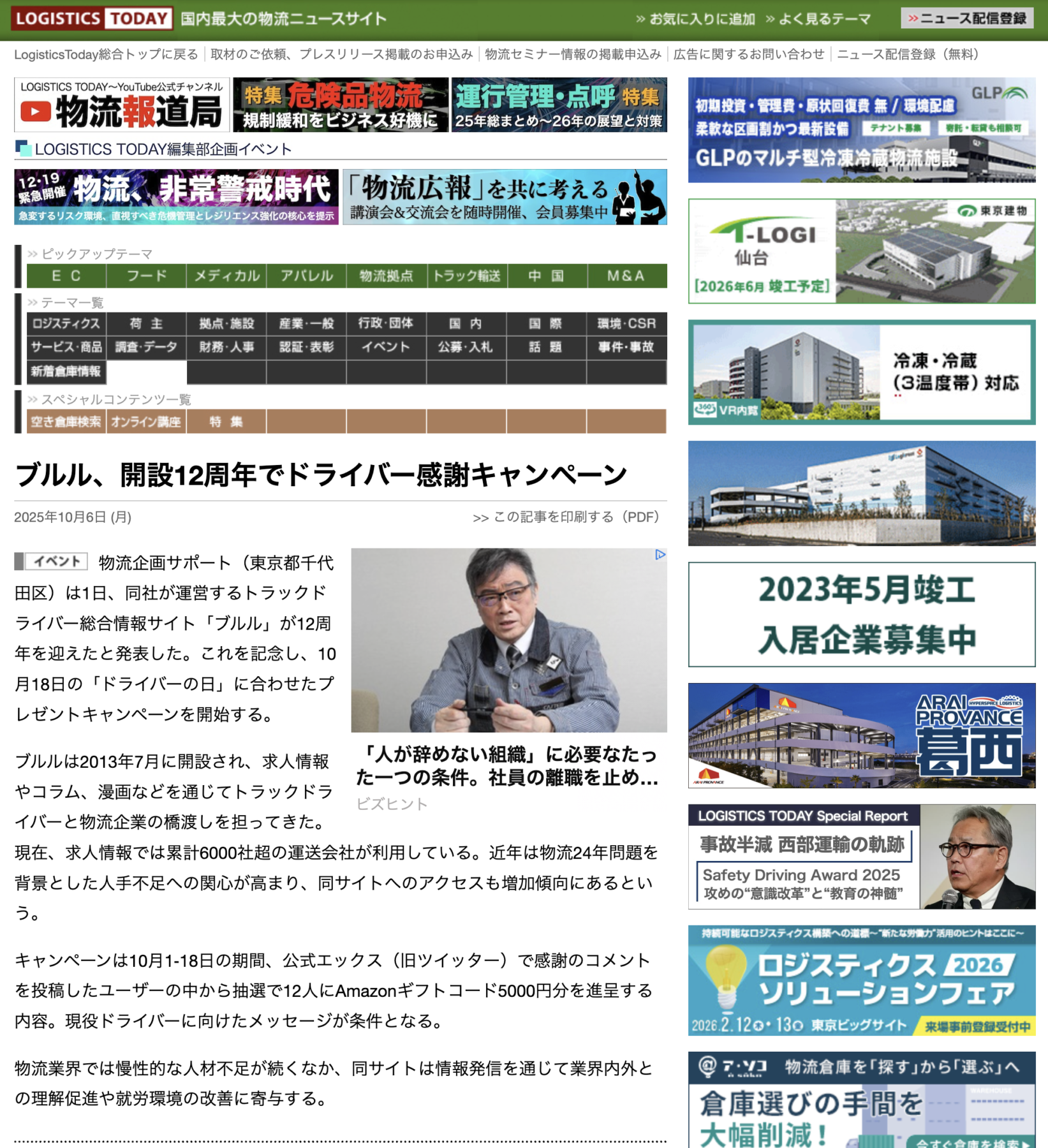 トラックドライバー総合情報サイト【ブルル】の12周年について、2025年10月6日付けの「Logistics Today」様にご掲載いただきました。誠にありがとうございます。